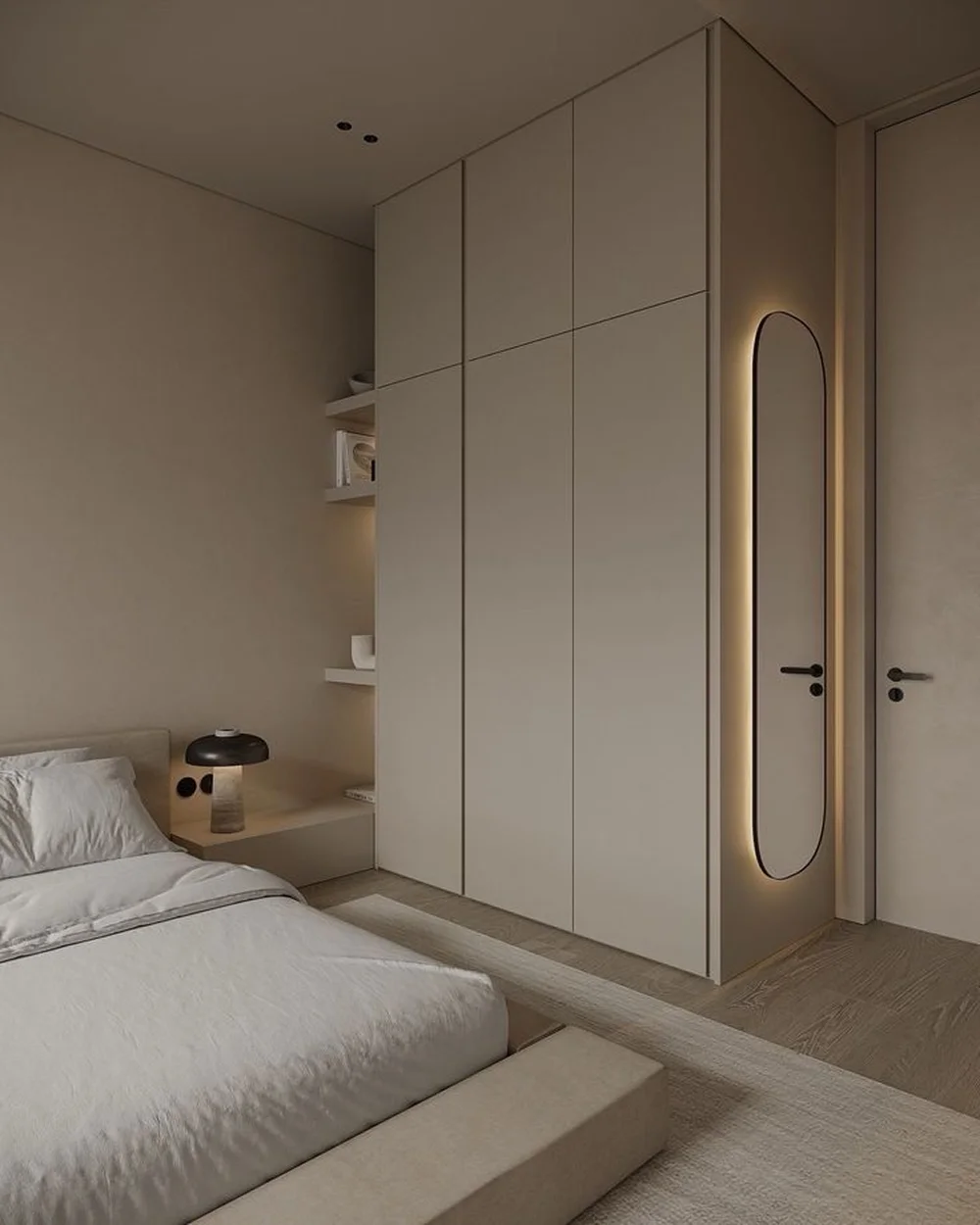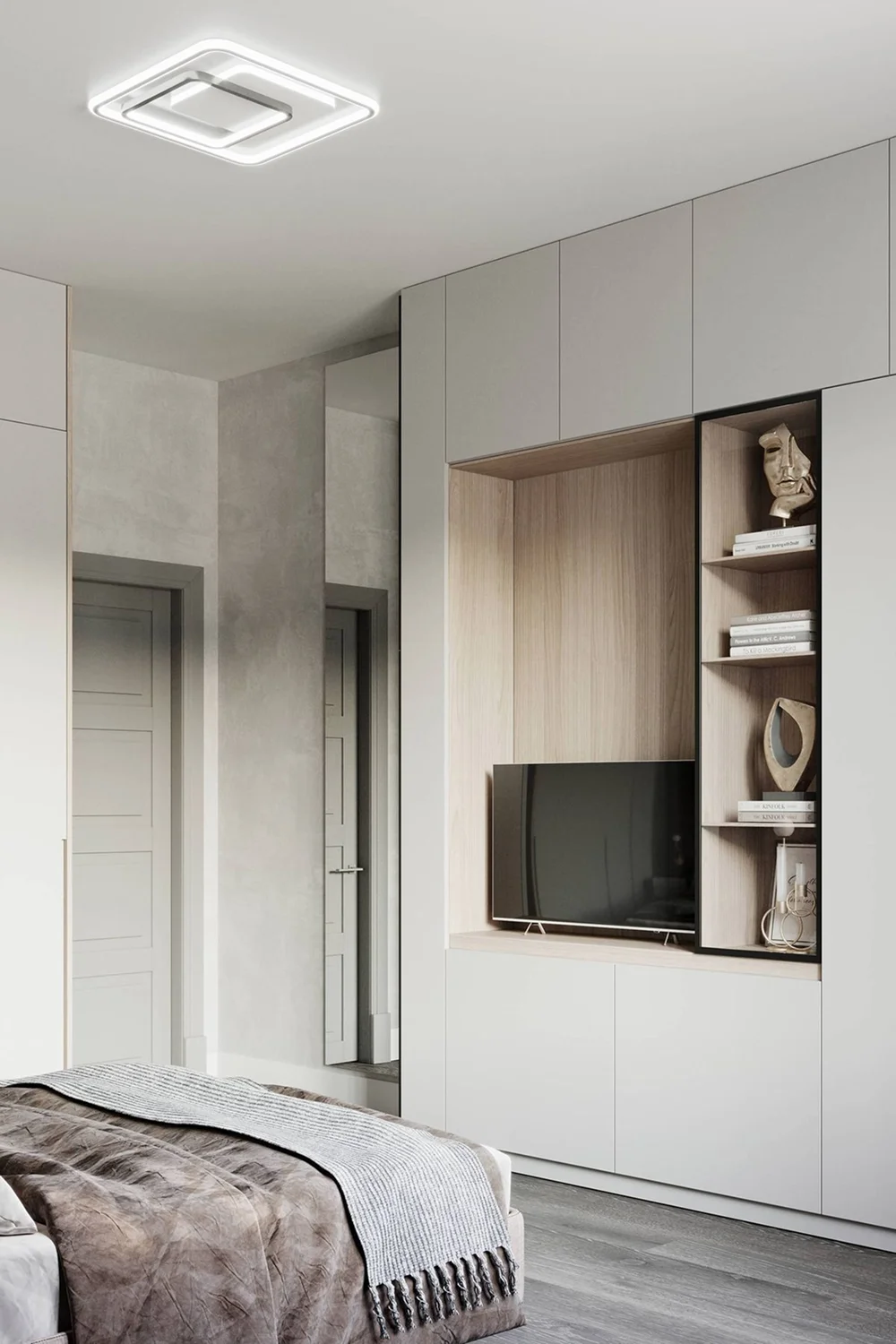 2. Расположение окон и освещение. Корпус не должен перекрывать источник естественного света и нарушать инсоляцию комнаты. Расположите мебель напротив окна, а если пространство маленькое — пусть дверцы будут зеркальными. Такое решение визуально расширит небольшое помещение и поможет создать комфортное место для отдыха.