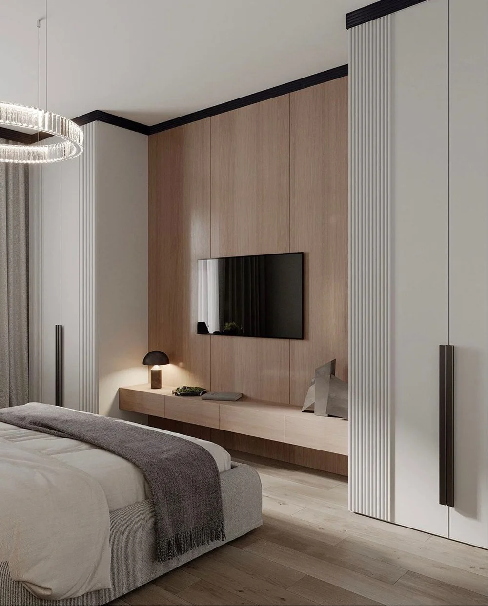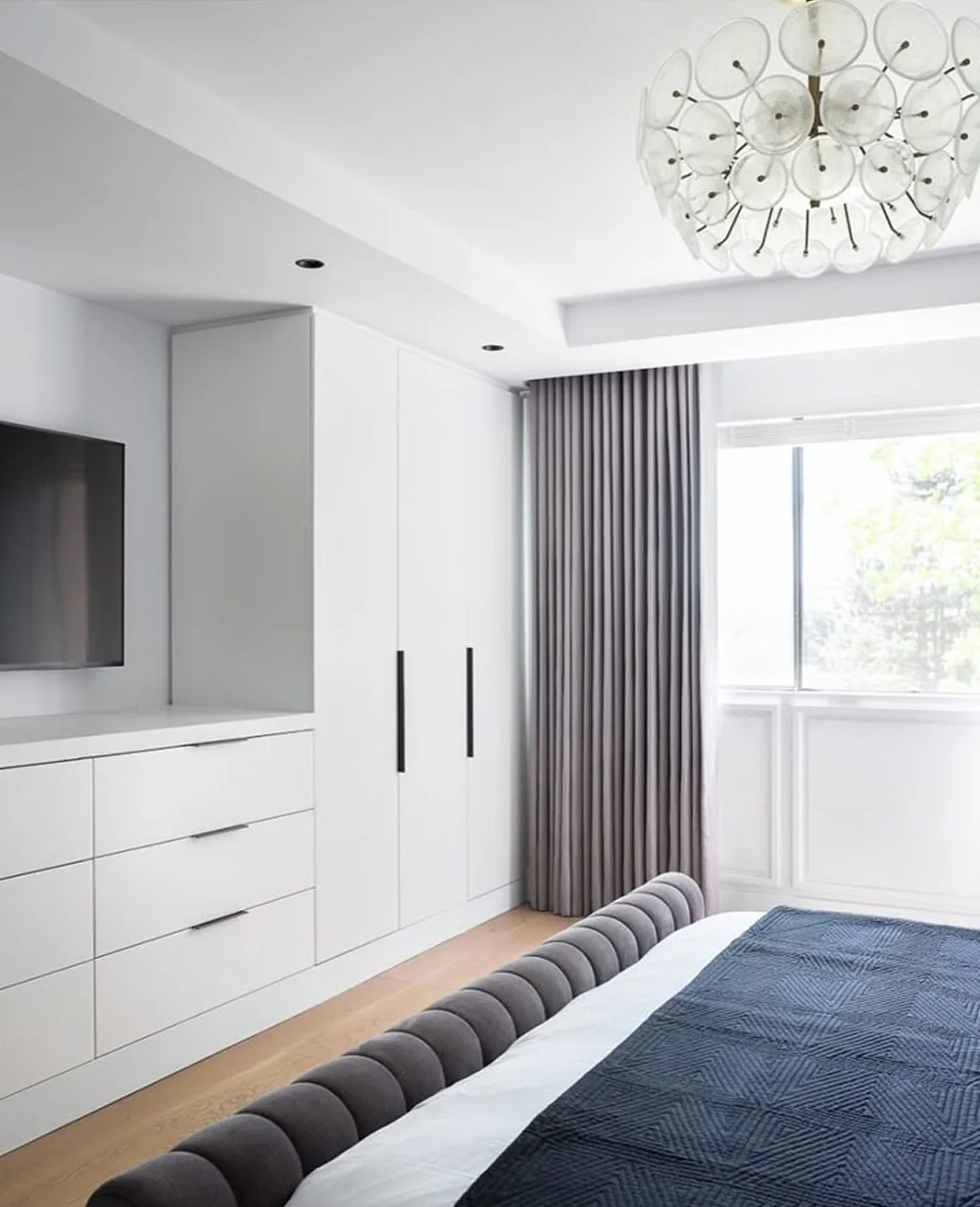 5. Баланс в интерьере. В высокой и узкой спальне правильно и красиво будет разместить гардеробную вдоль стены с торца. Если комната широкая и кажется непропорционально короткой — платяной шкаф может помочь зрительно «вытянуть» пространство. Для этого поставьте его вдоль длинной стены.