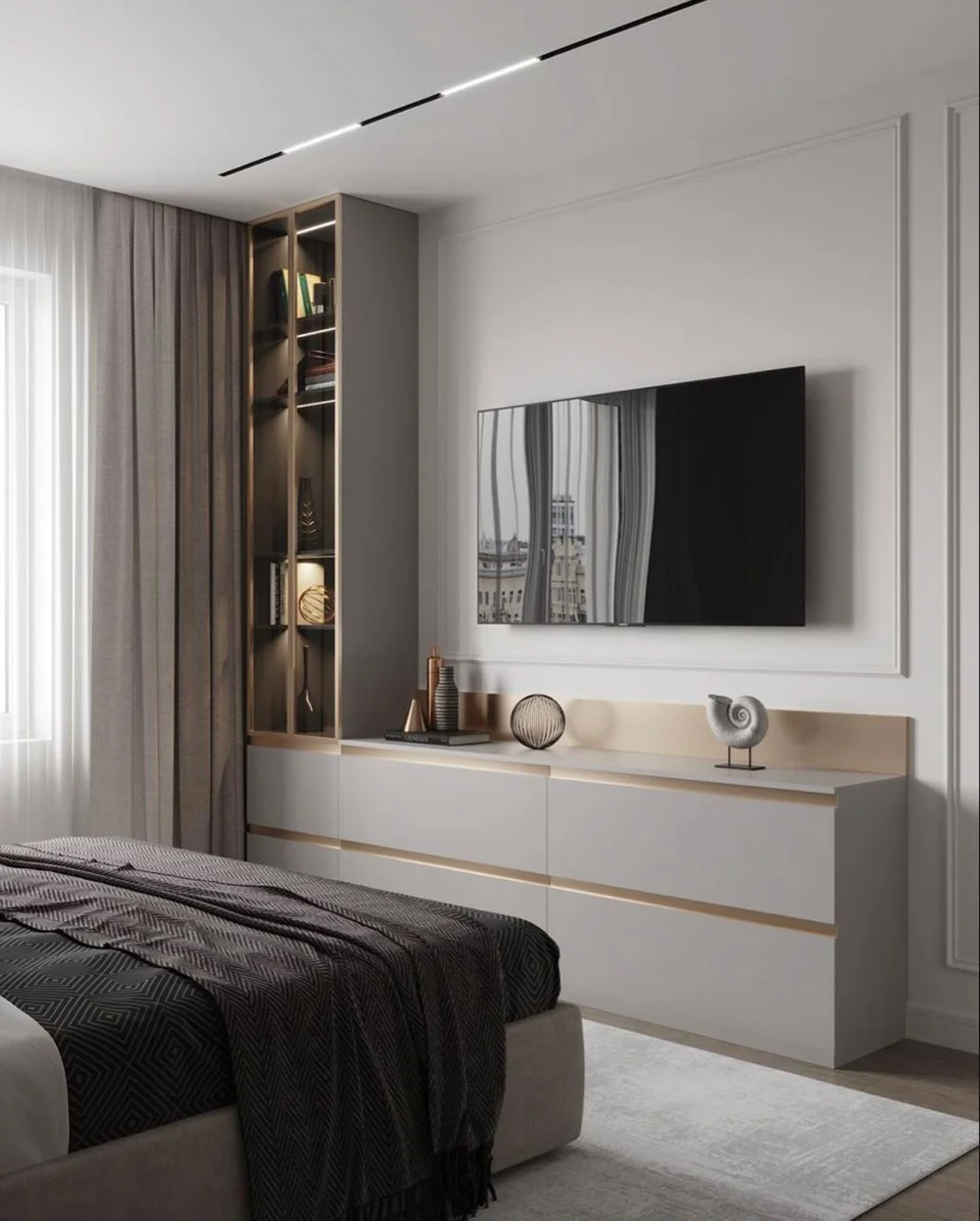 1. Размеры комнаты и расстояния. Оцените площадь спальни и свободные зоны. Учтите, что для прохода между системой хранения и другими предметами мебели нужно хотя бы 70 см.
