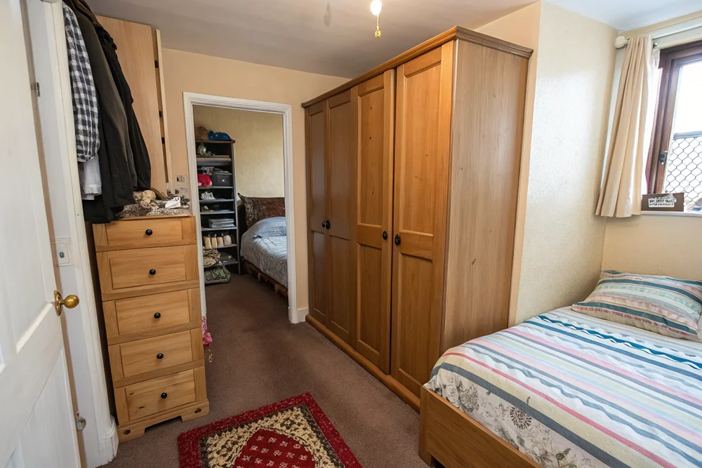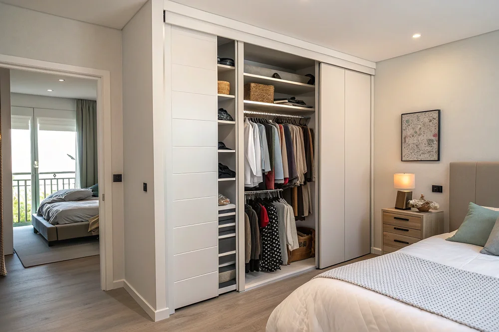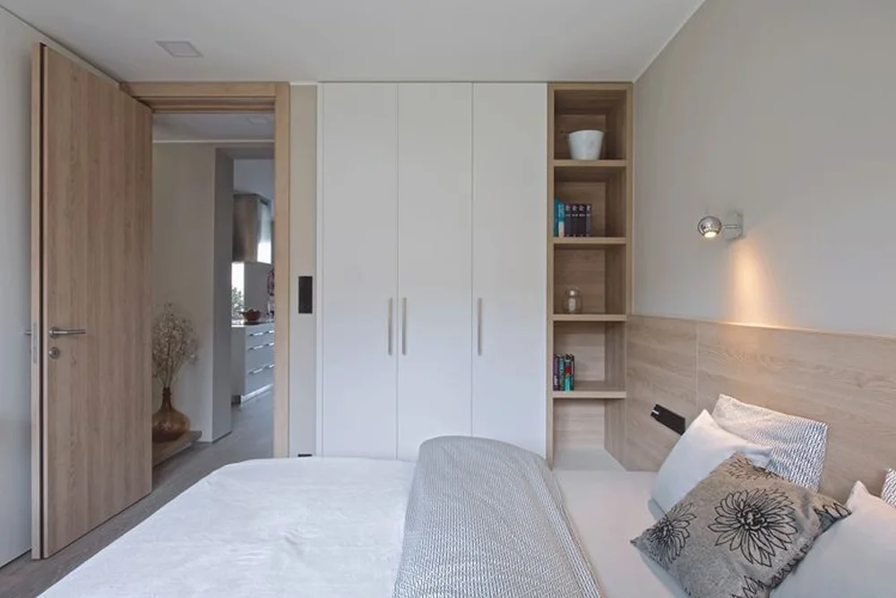 2. В тесном проходе, если двери распашные. Такой механизм требует свободного места, равного ширине створки. Если пространства в спальне мало, доступ к вещам будет неудобным.