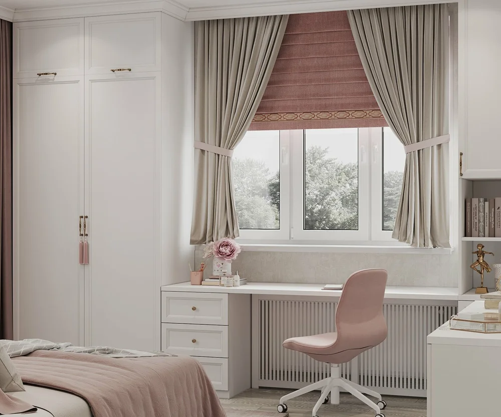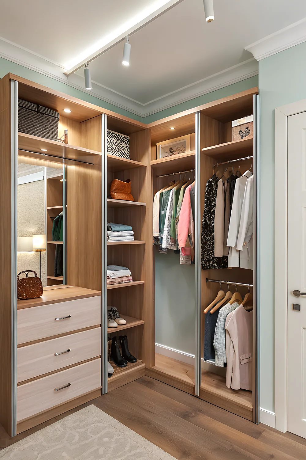 В небольшой комнате шкафы-купе актуальнее распашных моделей. Они экономят до 50-60 см пространства, необходимого для открытия створок. Еще хорошо будет смотреться угловая система хранения. За счет компактности она освободит место у стен для дополнительной мебели — тумбочки или комода.