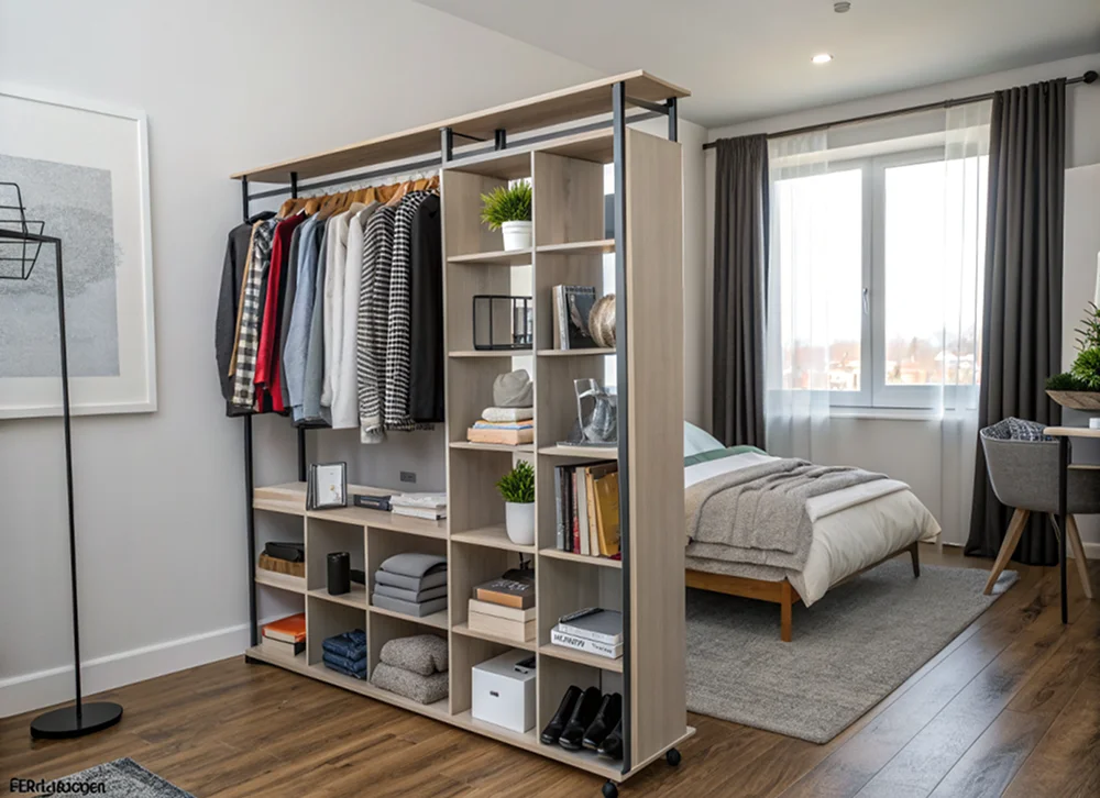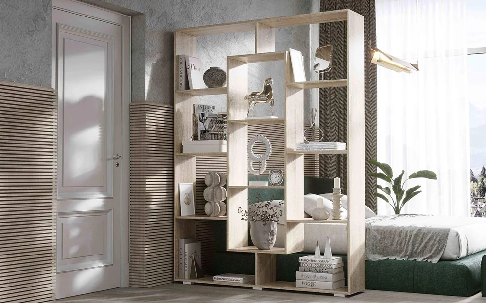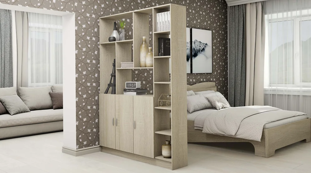 2. Шкаф-перегородка для зонирования. Удобен, если спальня совмещена с гостиной или детской. Лучше всего подойдет стеллаж, к которому есть доступ с обеих сторон.