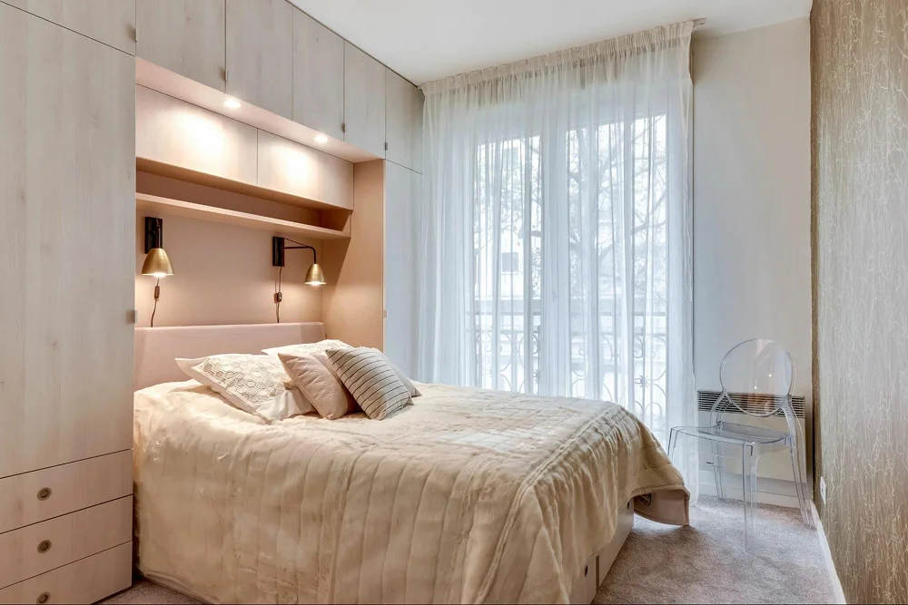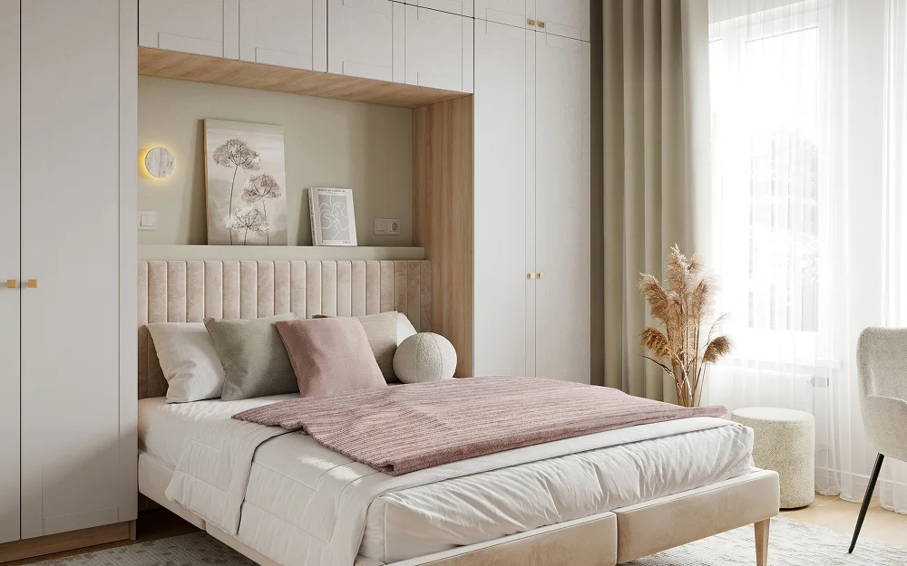 Учитывайте архитектурные особенности, когда расставляете мебель в маленькой спальне. Если есть ниша — закажите модель, которая идеально впишется в нее. В небольшой комнате такое лаконичное решение особенно уместно. Часто ниши образуются по бокам от выступа, скрывающего вентиляционный стояк. Если разместить мебель в таком проеме — это превратит технический недостаток в преимущество.