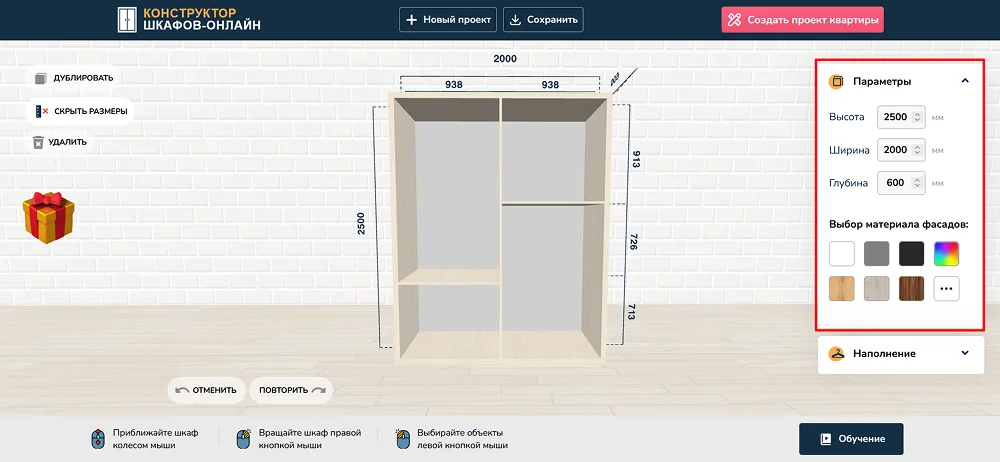 2. Во вкладке «Параметры» настройте габариты и выберите отделочный материал.