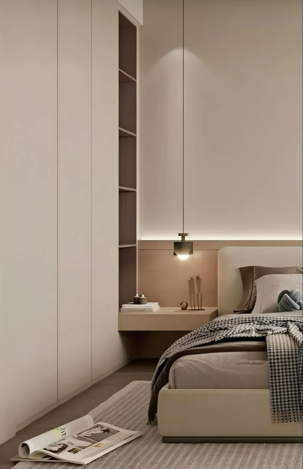 5. Вокруг двуспальной кровати с большой нишей. Верх корпуса будет подвесным и расположится над изголовьем. Основные части разместите с двух сторон от спального места.