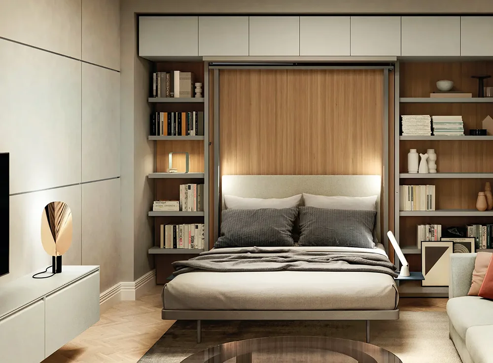В маленьком пространстве популярны решения, помогающие сэкономить место. Вещи хранят в органайзере на внутренней стороне дверей, выдвижных вешалках и пантографах. Популярна мебель-трансформер — например, с откидным спальным местом. Днем модель складывается и освобождает место, а вечером можно снова поставить кровать.