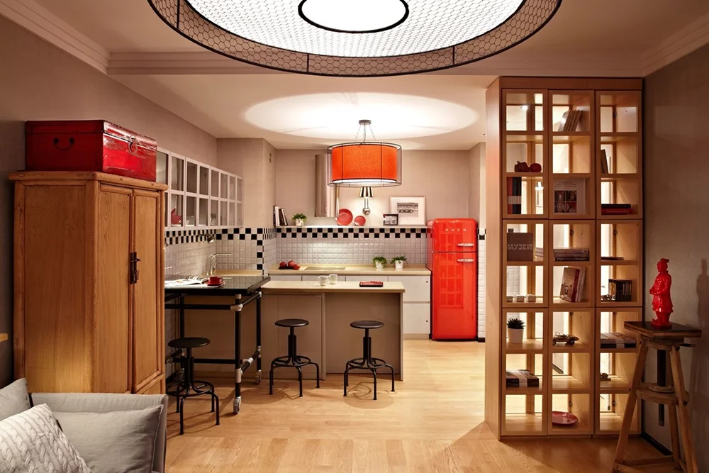1. Совмещение с кухней (квартира-студия). Здесь важно сделать объемное хранилище, но не перегружать открытое пространство. Так сохранится ощущение легкости. Мебель в этой комнате — например, двусторонний шкаф-перегородка — подойдет для зонирования. Важно: материалы фасадов со стороны кухни должны быть устойчивы к влаге и жиру. Обязательно оборудуйте зону готовки хорошей вытяжкой, чтобы вещи не впитывали запахи.