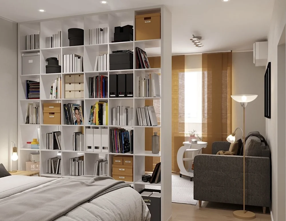 2. Спальня-гостиная. Стеллаж для зонирования, который подходит по интерьеру к обеим комнатам — хороший вариант. Еще подойдет встроенная конструкция, которая сливается со стеной. Это создаст чистый, лаконичный интерьер.
