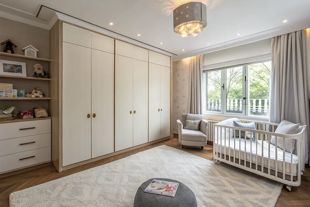 3. Спальня-детская. Хранение вещей родителей и ребенка должно быть по возможности раздельным. Можно установить две модели разной высоты или одну, но с четким делением внутри. Безопасность в приоритете: избегайте стеклянных и зеркальных вставок в детской зоне, выбирайте мебель со скругленными углами или купите накладки на них.