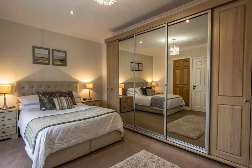 1. Напротив кровати, если дверцы с зеркалом. Отражение спящих людей может создавать беспокойство. Если хотите расположить шкаф около кровати, выбирайте модель без зеркал.