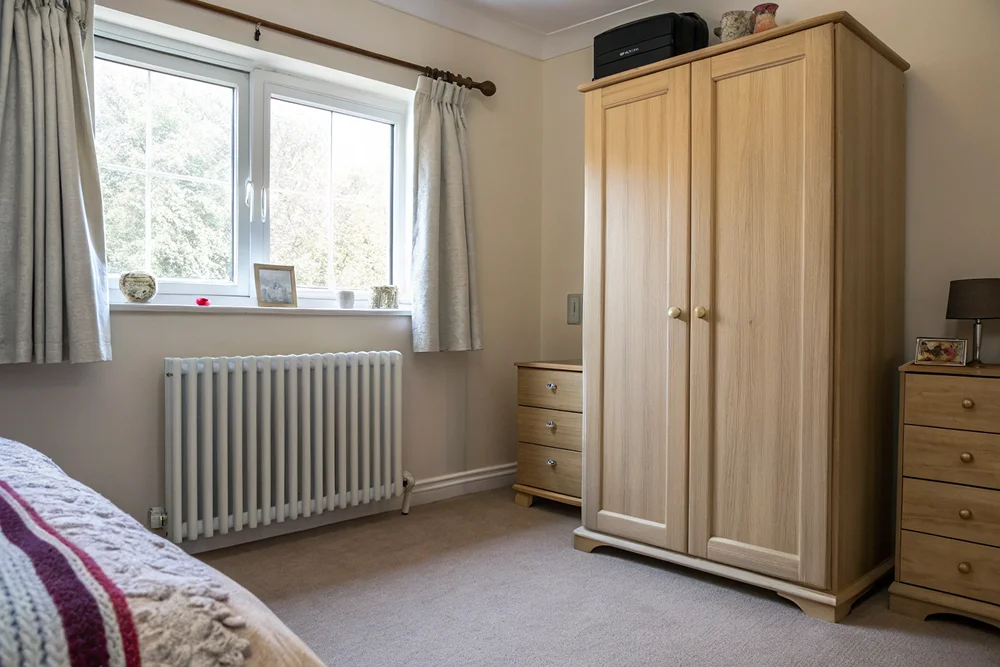 4. Рядом с отопительными приборами. Такое размещение нарушает циркуляцию теплого воздуха, делает обогрев менее эффективным и повышает нагрузку на котел. Корпус возле батареи тоже портится: дерево рассыхается и трескается, ЛДСП может деформироваться, а фасады — изменить цвет.
