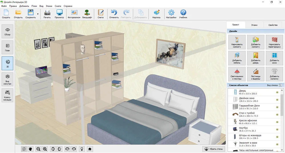 Мы дали советы по выбору места для системы хранения. Продуманный дизайн спальни позволяет сохранить ощущение простора даже там, где места мало. Чтобы сразу увидеть, как корпус будет сочетаться с остальной мебелью, удобнее всего сделать планировку в программе. Отлично подойдет простой и удобный софт Дизайн Интерьера 3D.